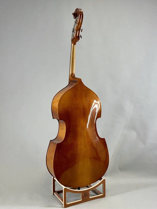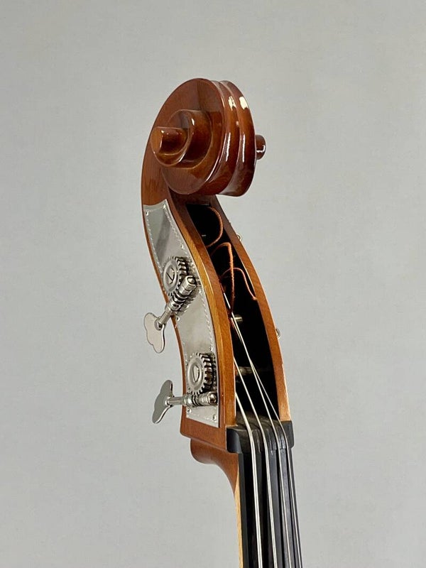 Made by the Hora company in Reghin in 2021, this is a fully plywood bass in mint condition. The instrument was owned by a jazzmusician who used it for acoustical experimentation as well as Mingus's gut-string style! Quite the range for a modest bass like this, it comes with an extra bridge (higher for gut-strings) and a nut prepared for 3-string playing as well. A European-made bass, fully set-up in our Brussels workshop, with ebony fingerboard and tailpiece! Stringlength 104 cm with Belcanto strings.