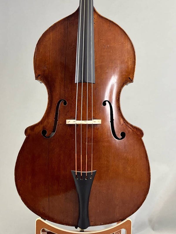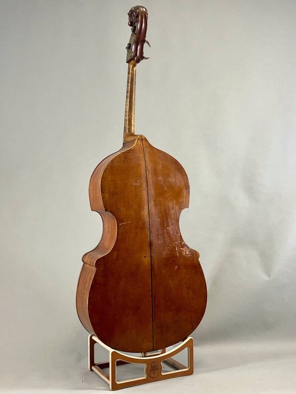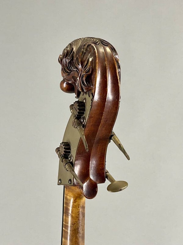 Bearing a restoration signature from 1912, this bass has survived quite some turmoil in Europe. Built in Mittenwald in 1905 by the Rieger family, this is quite the beast. Characterized by it's Busseto-style contour and lion-head, the look is quite captivating. It has period-correct hand-made tuners and is fully restored and stable.
