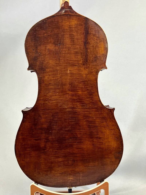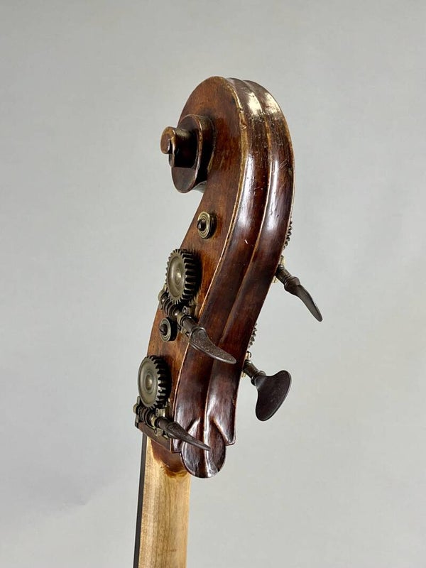 Quite a remarkable bass, this one! A bass which started its life in a French workshop, but appears to have been finalized in the UK. It currently sports an M.G. Healy bridge, and has been repaired in 2008, including a soundpostpatch. It has the original soundpostbrace, replaced bassbar, lovely French tuners, a very well-excecuted neckgraft, a new ebony fingerboard and a fully functional C-extension with Anzelotti capo's. It can be used with or without said extension due to an extra E-nut, and has proven itself both in solistic settings, orchestral settings and gutstrings!s
